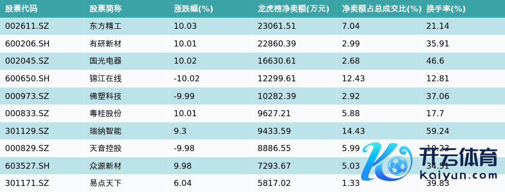 南边财经11月25日电开yun体育网开yun体育网,南财金融末端数据表现,因当日异动登上龙虎榜的个股中,龙虎榜中资金净流出最多的前三位永别是东方精工(002611.SZ)、有研新材(600206.SH)与国光电器(002045.SZ)。其中排行第一的东方精工被净卖出2.31亿元,占总成交金额的7.04%。东方精工收盘高涨10.03%,换手率为21.14%。净卖出额前10个股细目见下图:
